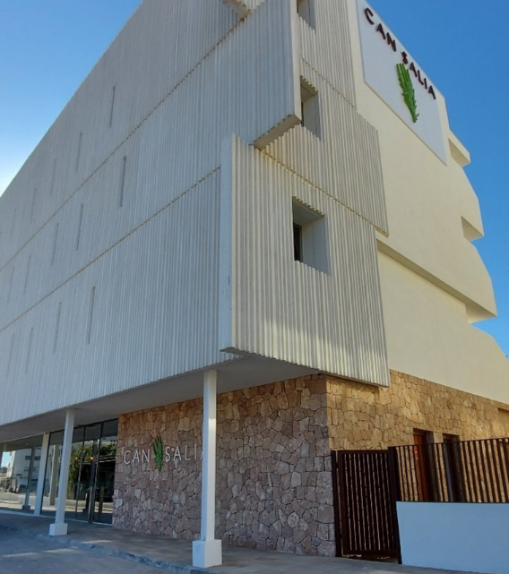 Gracias a la extensa reforma que se realizó en el Hotel Can Salia, y cuyo cerramiento de la fachada tan solo duró un mes, se logró conseguir un alojamiento con un diseño mucho más limpio, elegante e innovador, en el que se generan especiales efectos de luz.